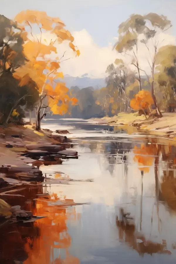 Poster Őszi táj, folyó fákkal a partján, erdő a háttérben, tükröződések a vízen Nr f46280