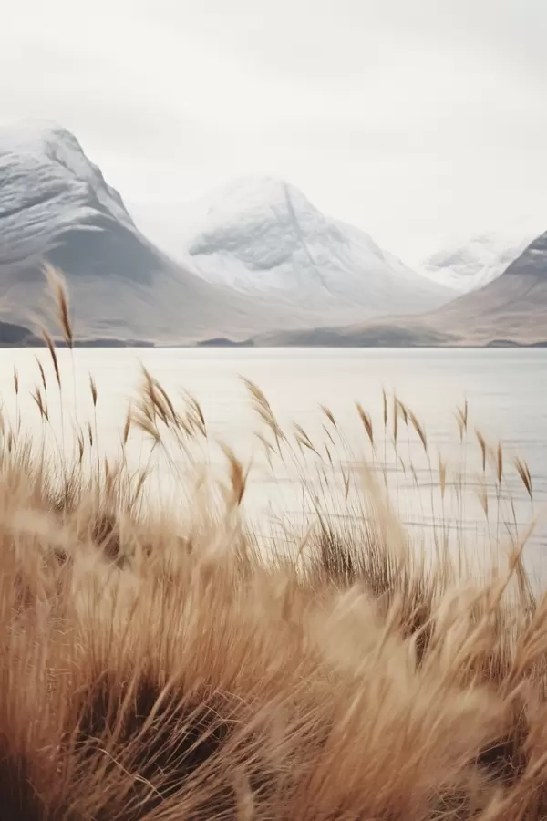 Poster Pampas fű mező egy tó előtt, háttérben havas hegyekkel, lágy fényben Nr f46282