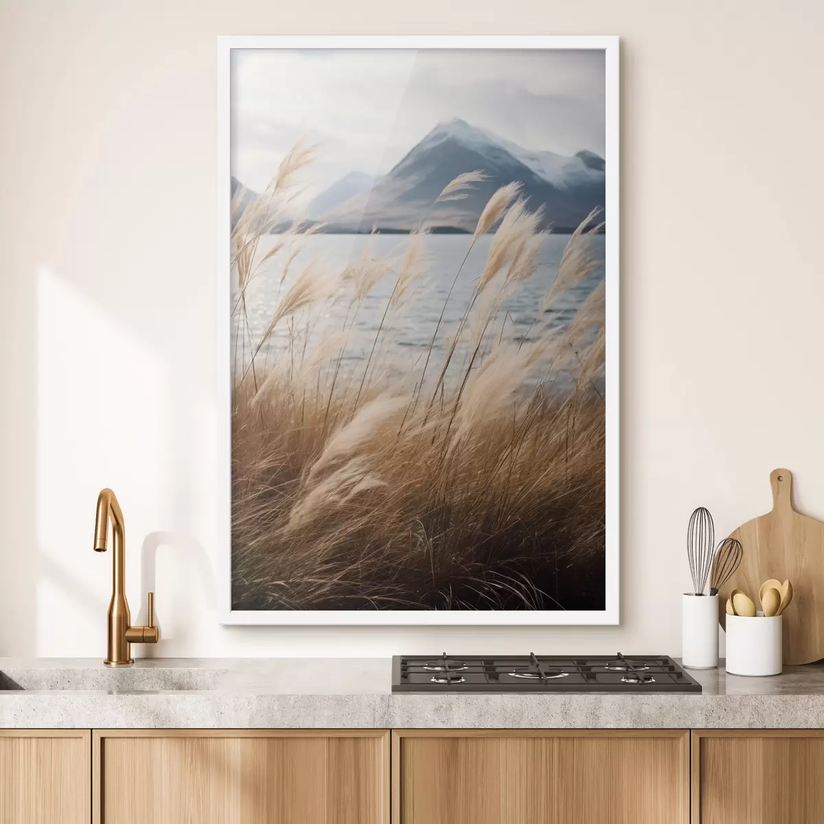 Poster Pampas fű, háttérben tóval és hegyekkel, lágy megvilágítás, tompított színek, naturalisztikus stílus Nr f46283