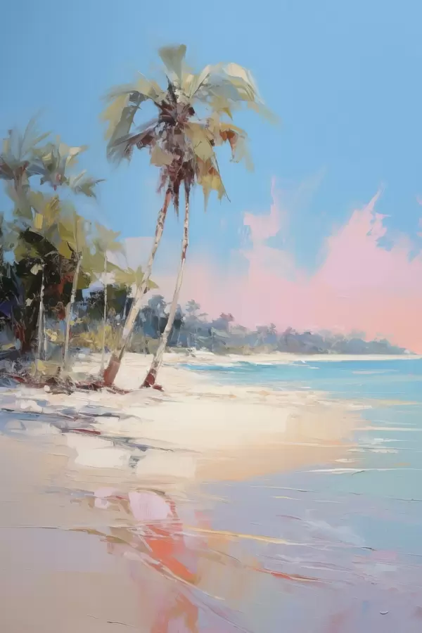 Poster Absztrakt trópusi strand fehér homokkal és pálmafákkal, kék ég fehér felhőkkel Nr f46285