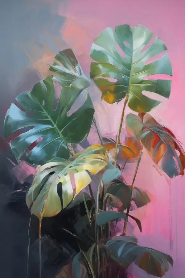 Poster Absztrakt monstera növény élénkzöld levelekkel, lágy rózsaszín és lila árnyalatok háttérében Nr f46286
