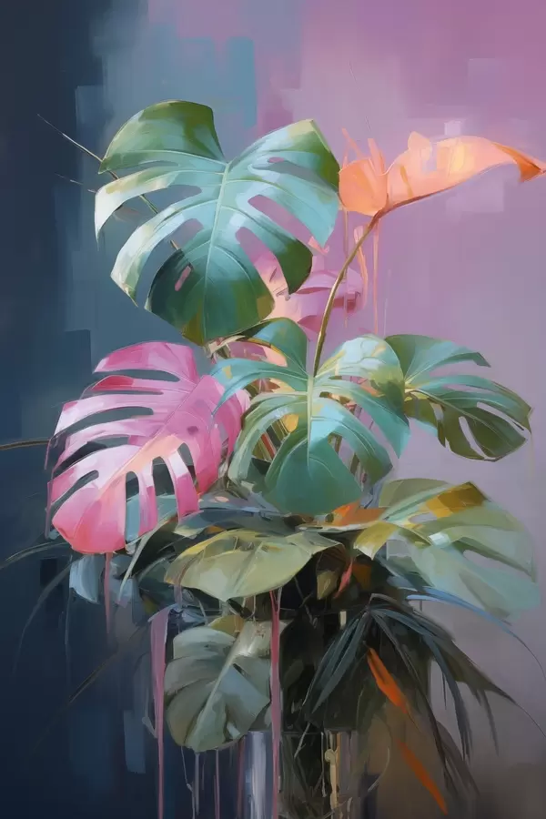 Poster Absztrakt monstera növény rózsaszín és zöld levelekkel, élénk színekkel, homályos háttér előtt Nr f46287