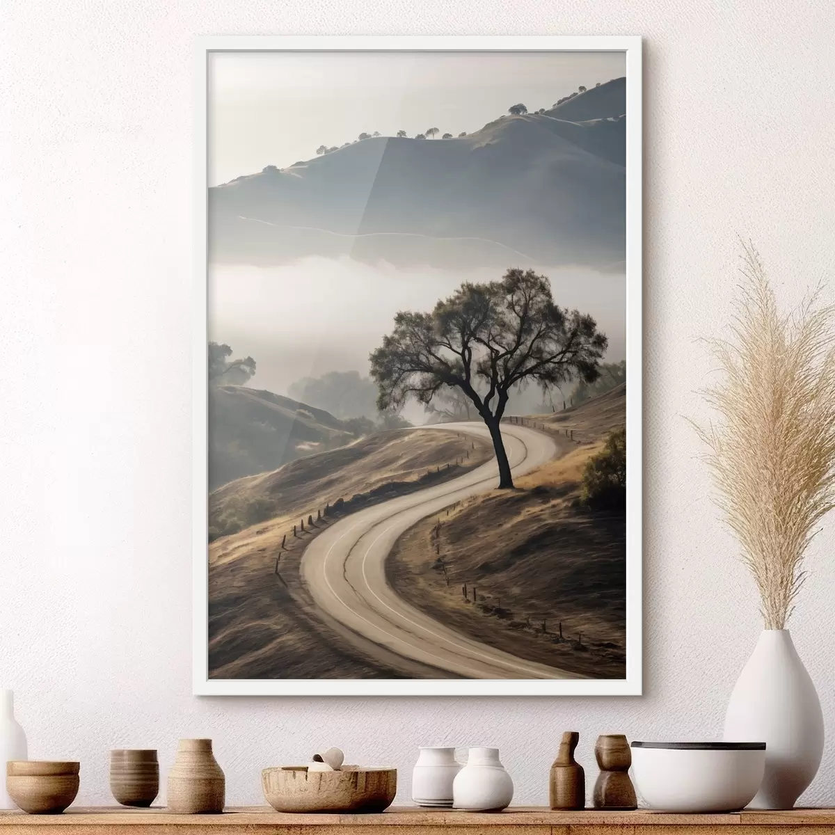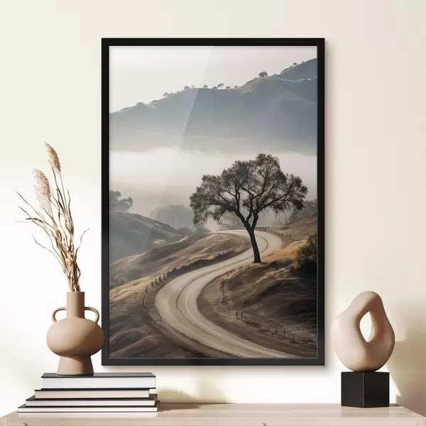 Poster Kanyargós út hullámzó dombok között, előtérben egy fa, háttérben köd és hegyek Nr f46288