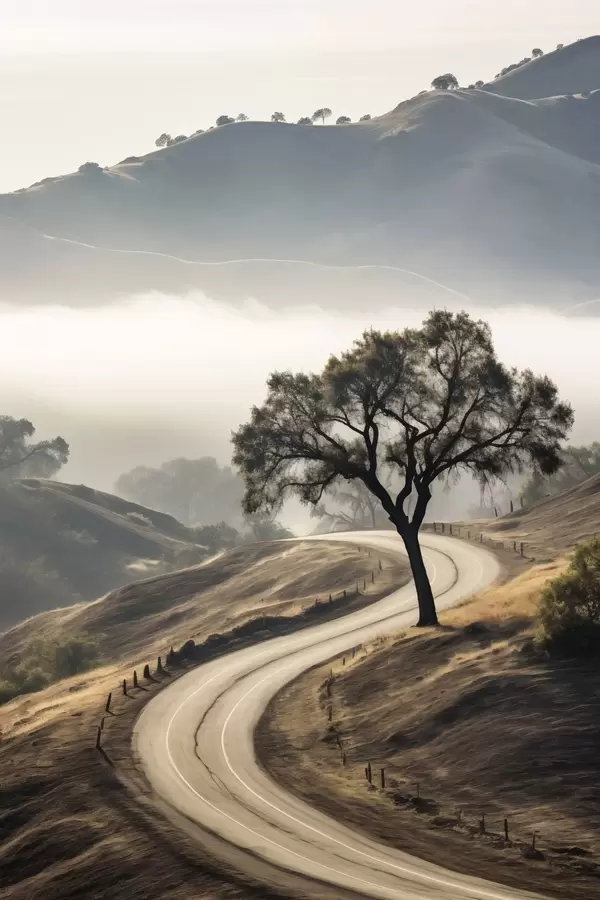 Poster Kanyargós út hullámzó dombok között, előtérben egy fa, háttérben köd és hegyek Nr f46288