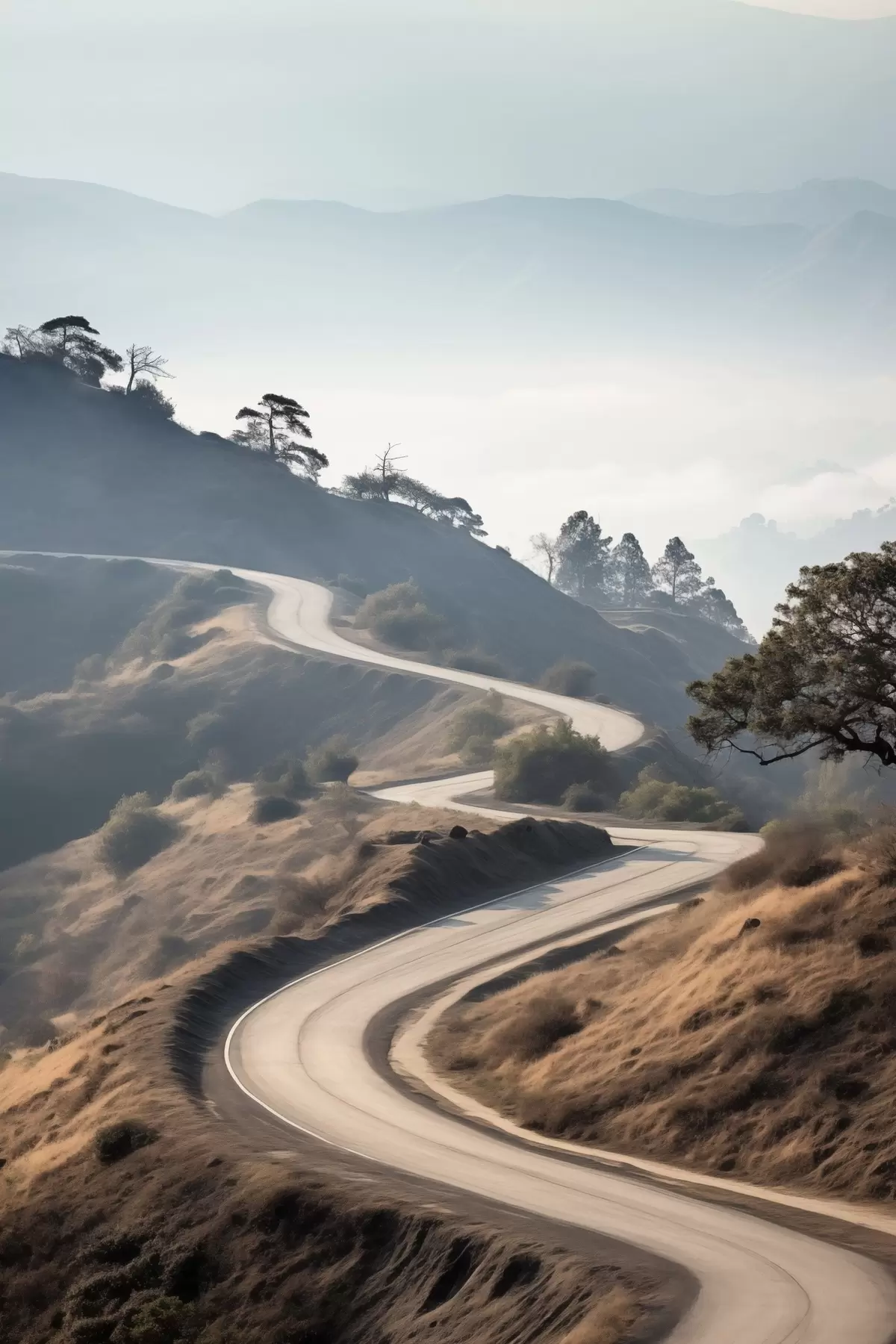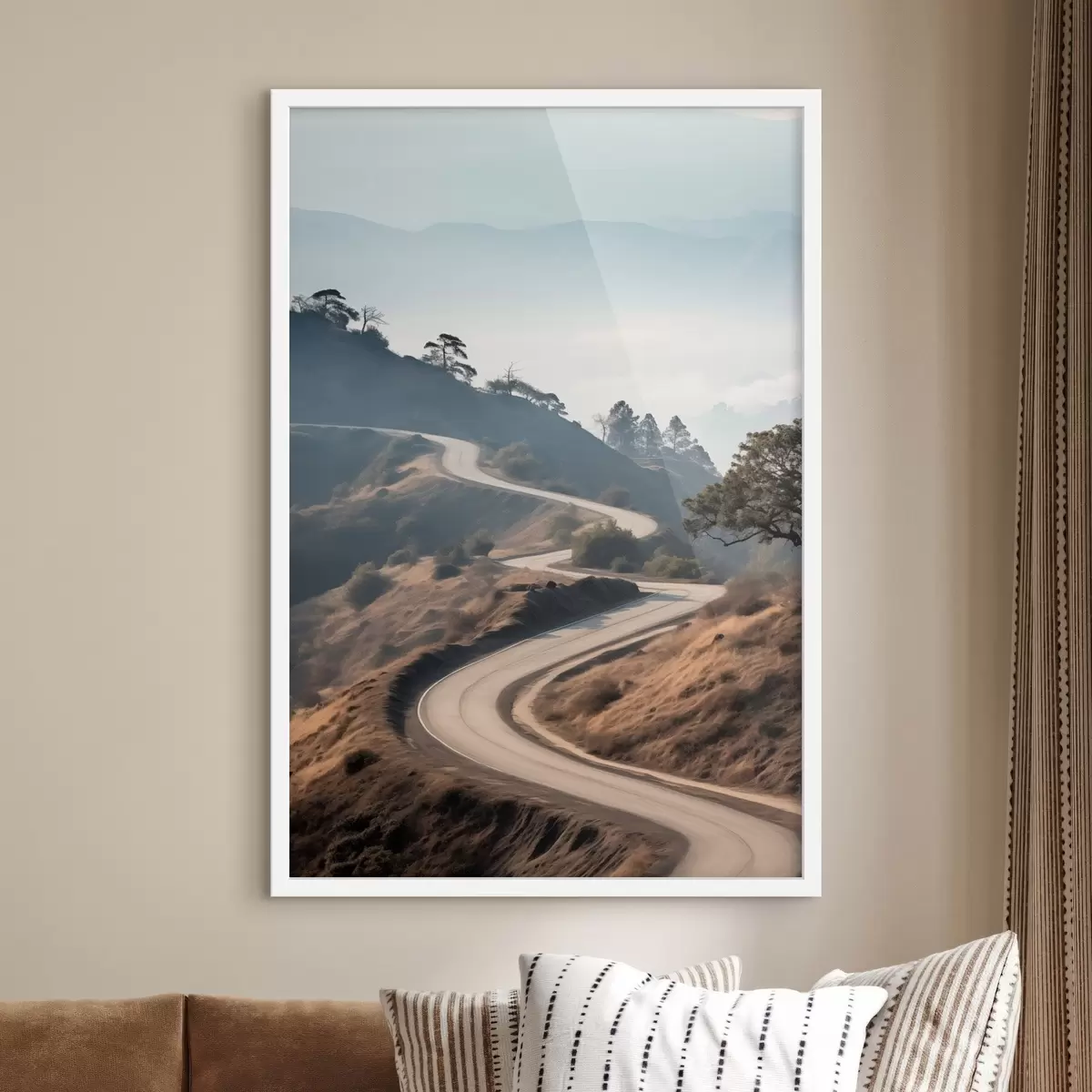 Poster Kanyargós út dombos tájban, száraz fűvel, tiszta égbolttal és a távolban látható hegyekkel. Nr f46289