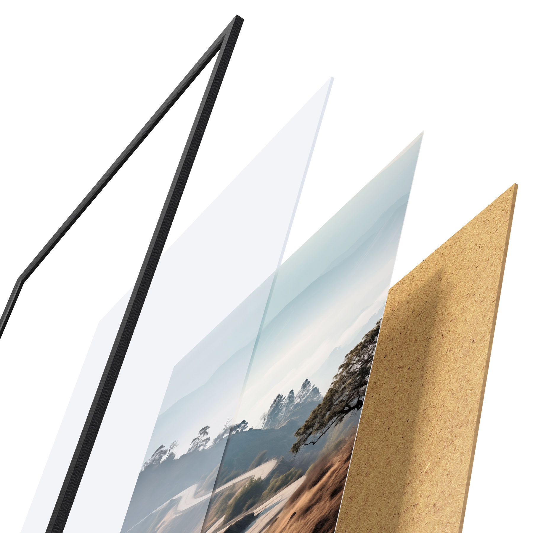 A poszter keretből, plexiből, nyomtatott képből és forgácslap hátlapból áll. A poszter a hátoldalon található rögzítőknek köszönhetően azonnal felakasztható a falra.