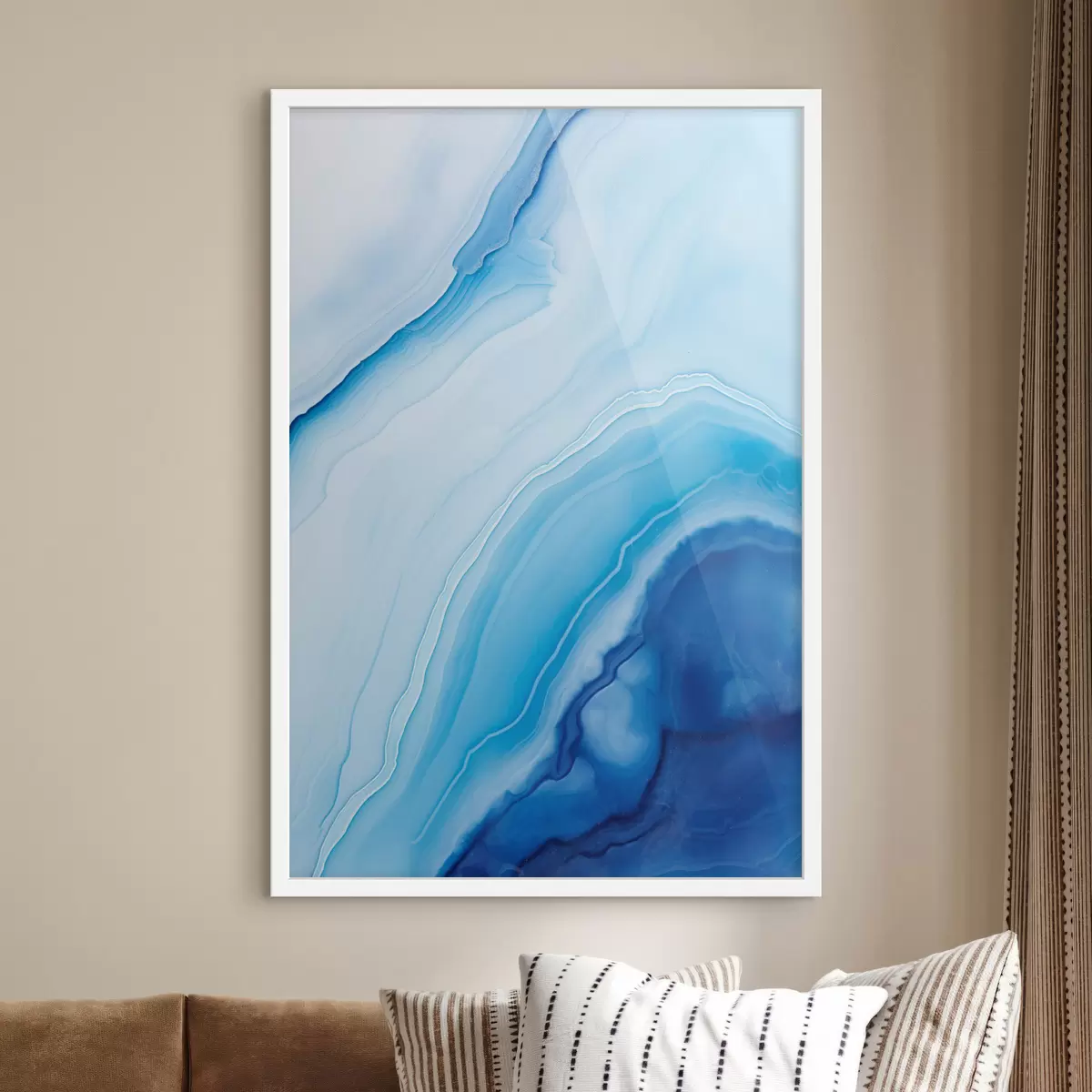 Plakát a sziklán Absztrakt kék-fehér achátminta, kavargó vonalak és színátmenetek, sima textúra, modern művészet, minimalista f46290