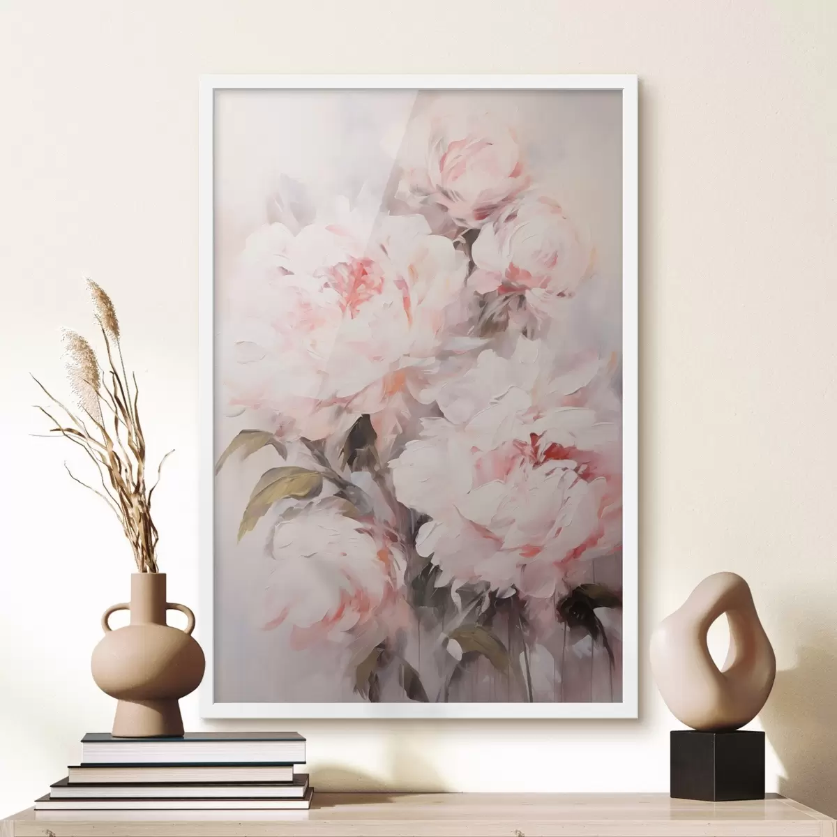 Poster Világos rózsaszín pünkösdi rózsák csokor zöld levelekkel, lágy ecsetvonásokkal, pasztell színekkel, világos háttérrel Nr f46294