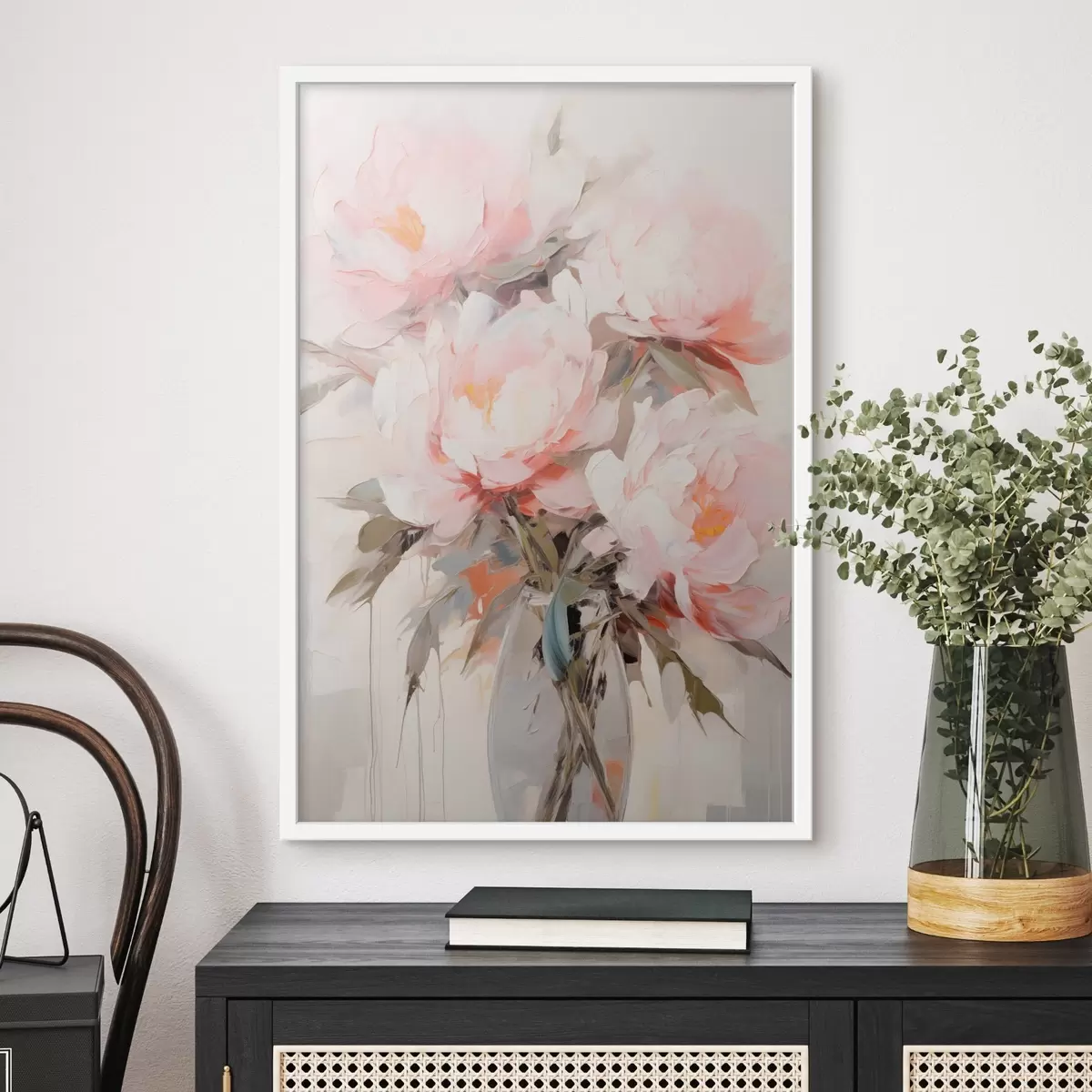 Poster Rózsaszín és fehér pünkösdi rózsák csokor üvegvázában, lágy ecsetvonások, pasztell színek, semleges háttér Nr f46295