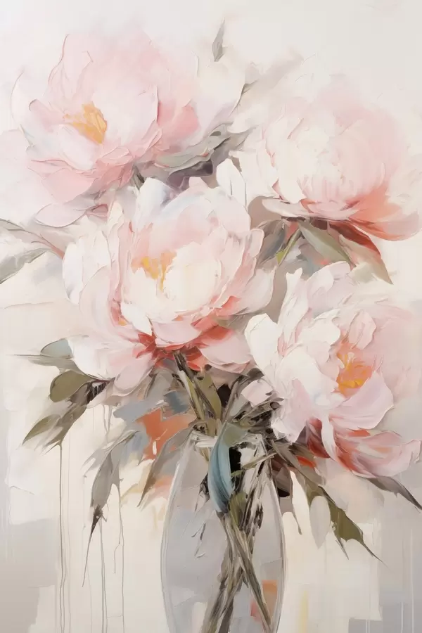 Poster Rózsaszín és fehér pünkösdi rózsák csokor üvegvázában, lágy ecsetvonások, pasztell színek, semleges háttér Nr f46295