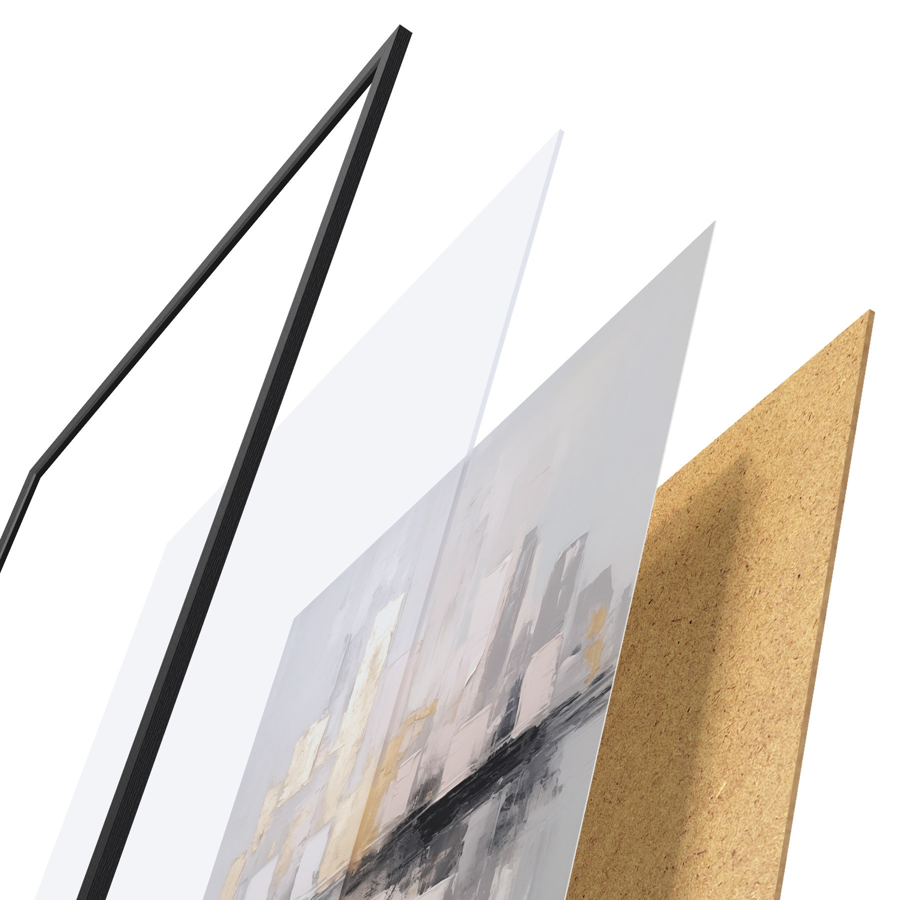 A poszter keretből, plexiből, nyomtatott képből és forgácslap hátlapból áll. A poszter a hátoldalon található rögzítőknek köszönhetően azonnal felakasztható a falra.