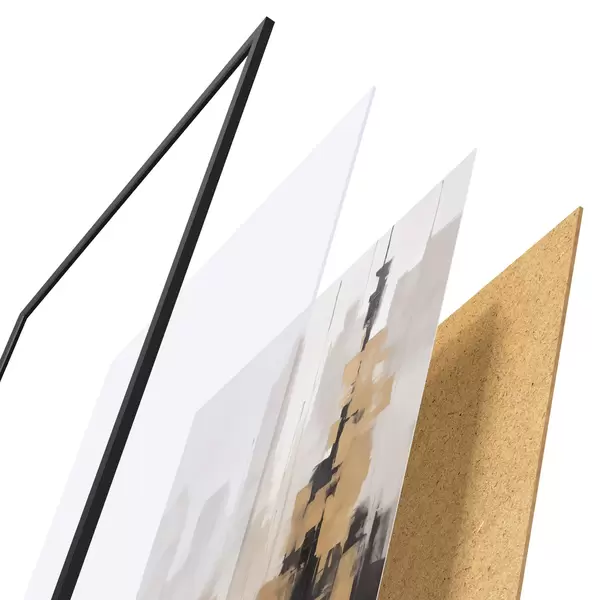 A poszter keretből, plexiből, nyomtatott képből és forgácslap hátlapból áll. A poszter a hátoldalon található rögzítőknek köszönhetően azonnal felakasztható a falra.