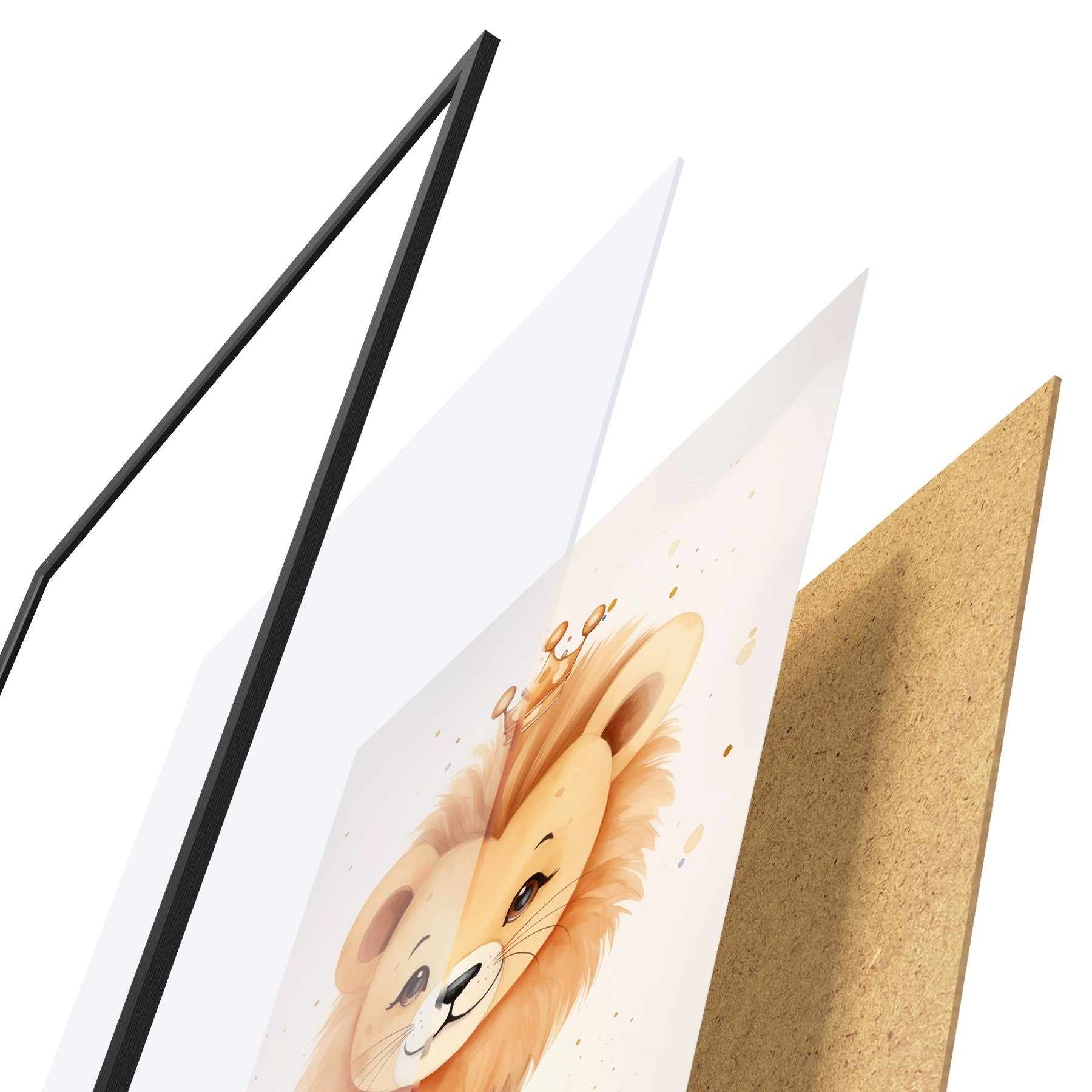 A poszter keretből, plexiből, nyomtatott képből és forgácslap hátlapból áll. A poszter a hátoldalon található rögzítőknek köszönhetően azonnal felakasztható a falra.