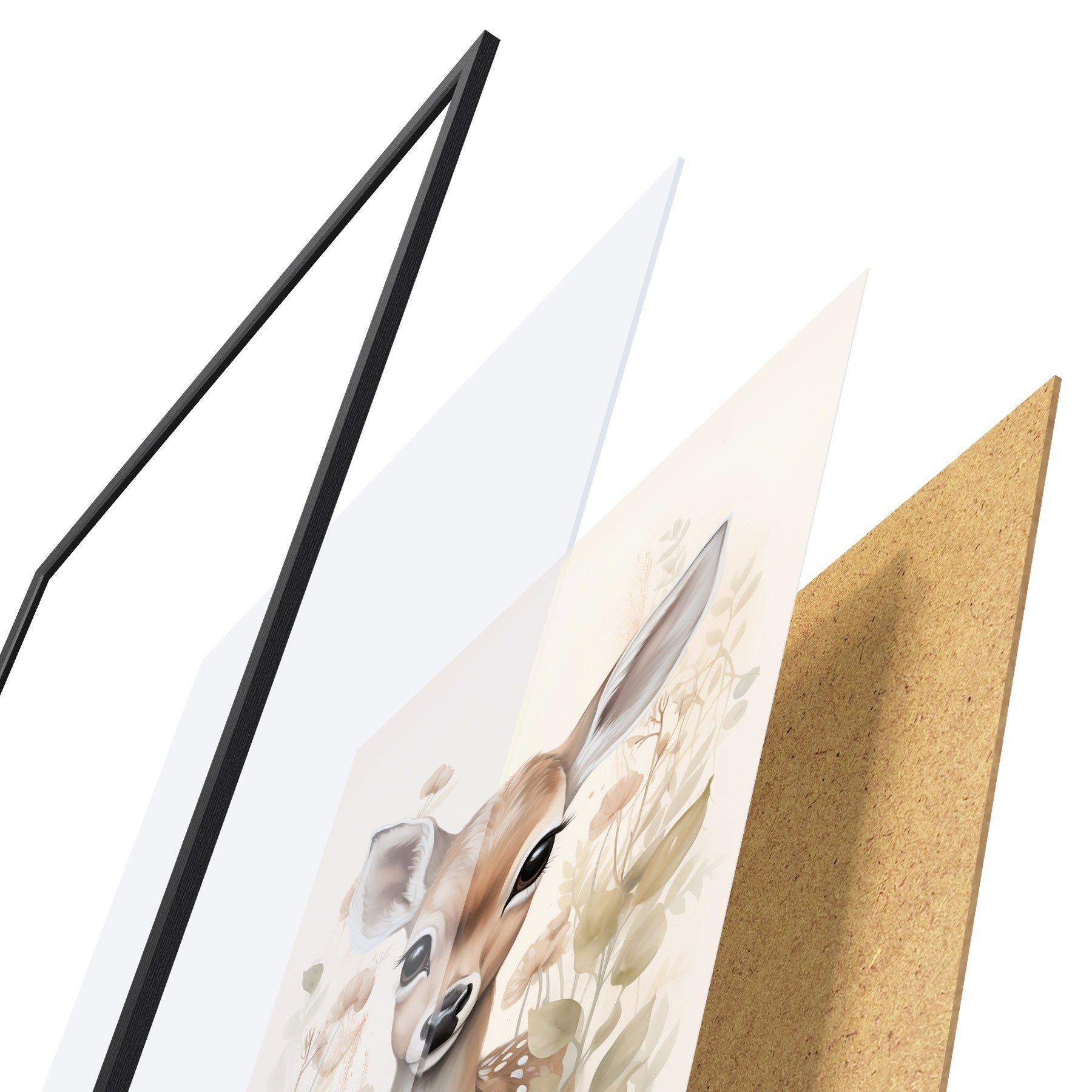 A poszter keretből, plexiből, nyomtatott képből és forgácslap hátlapból áll. A poszter a hátoldalon található rögzítőknek köszönhetően azonnal felakasztható a falra.