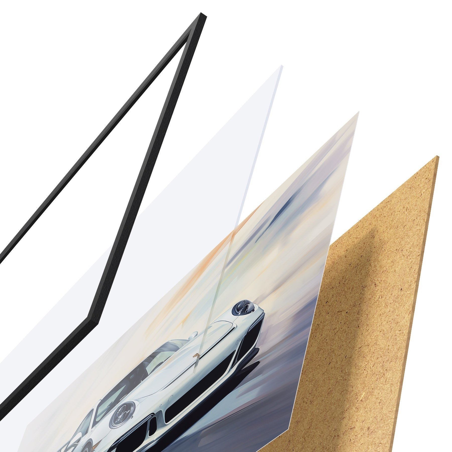 A poszter keretből, plexiből, nyomtatott képből és forgácslap hátlapból áll. A poszter a hátoldalon található rögzítőknek köszönhetően azonnal felakasztható a falra.