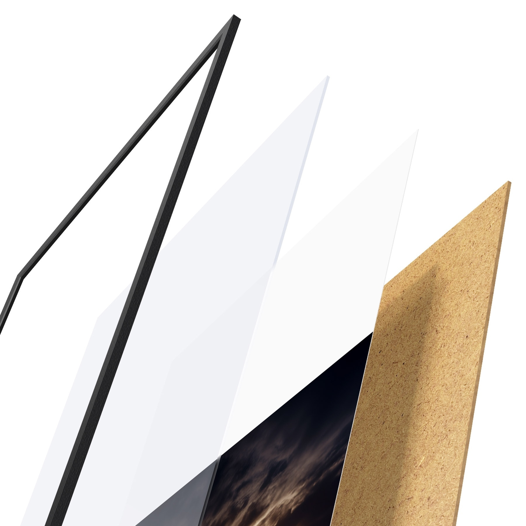 A poszter keretből, plexiből, nyomtatott képből és forgácslap hátlapból áll. A poszter a hátoldalon található rögzítőknek köszönhetően azonnal felakasztható a falra.