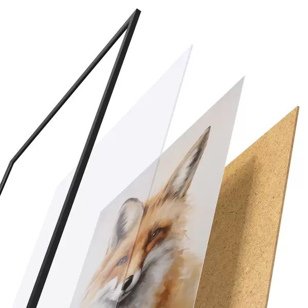 A poszter keretből, plexiből, nyomtatott képből és forgácslap hátlapból áll. A poszter a hátoldalon található rögzítőknek köszönhetően azonnal felakasztható a falra.
