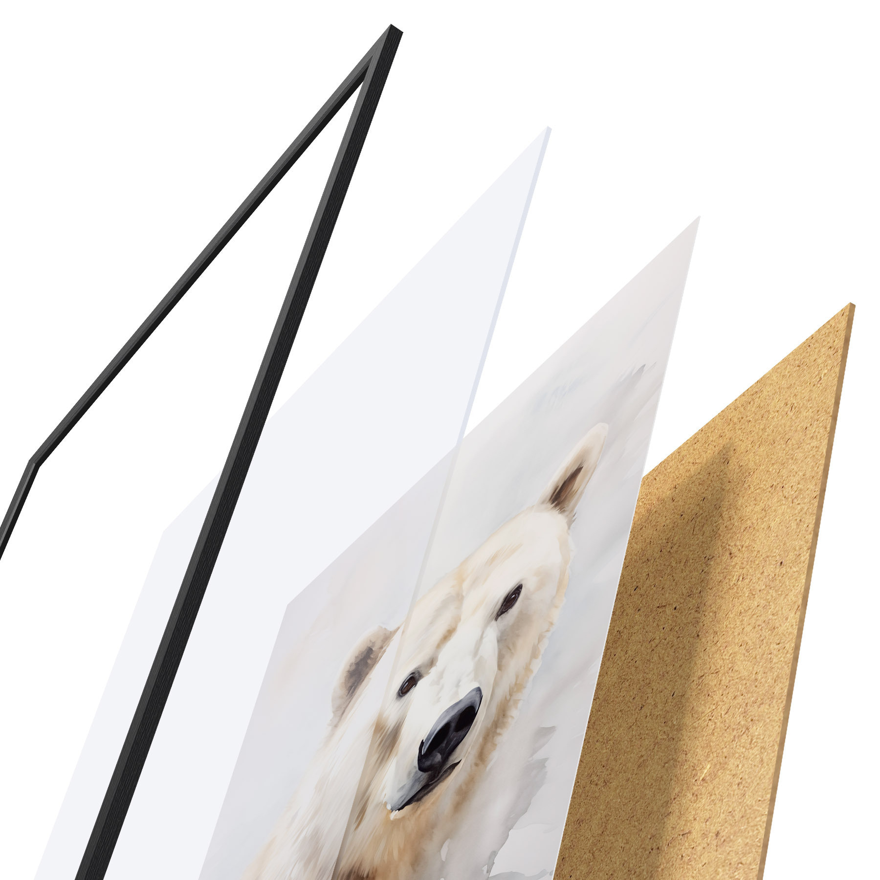 A poszter keretből, plexiből, nyomtatott képből és forgácslap hátlapból áll. A poszter a hátoldalon található rögzítőknek köszönhetően azonnal felakasztható a falra.