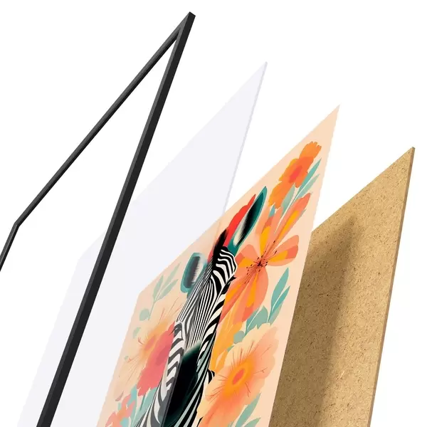A poszter keretből, plexiből, nyomtatott képből és forgácslap hátlapból áll. A poszter a hátoldalon található rögzítőknek köszönhetően azonnal felakasztható a falra.