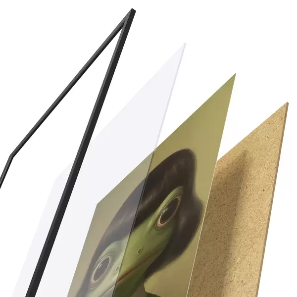 A poszter keretből, plexiből, nyomtatott képből és forgácslap hátlapból áll. A poszter a hátoldalon található rögzítőknek köszönhetően azonnal felakasztható a falra.