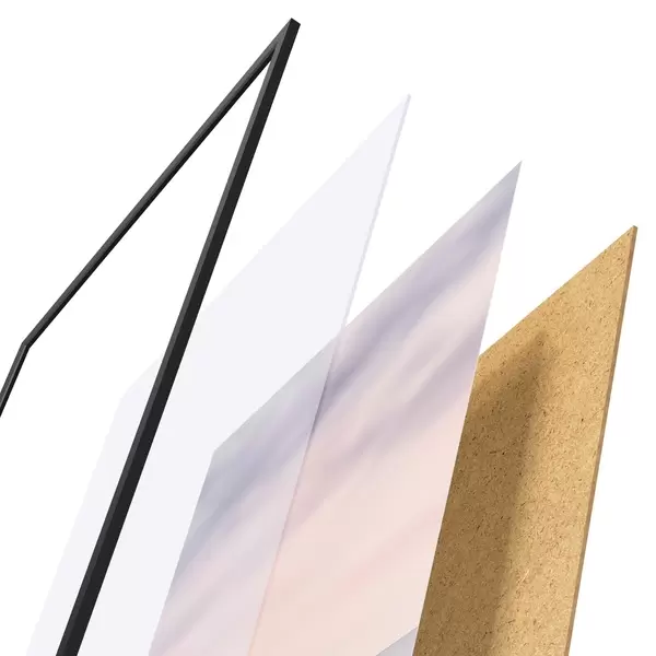 A poszter keretből, plexiből, nyomtatott képből és forgácslap hátlapból áll. A poszter a hátoldalon található rögzítőknek köszönhetően azonnal felakasztható a falra.