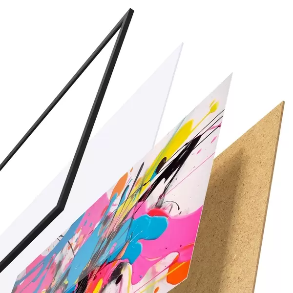 A poszter keretből, plexiből, nyomtatott képből és forgácslap hátlapból áll. A poszter a hátoldalon található rögzítőknek köszönhetően azonnal felakasztható a falra.