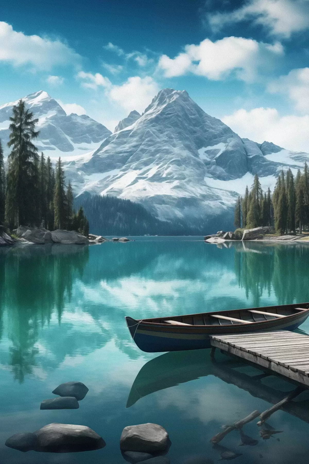 Plakát a sziklán Alpesi tó kenuval és havas csúcsokkal f46481