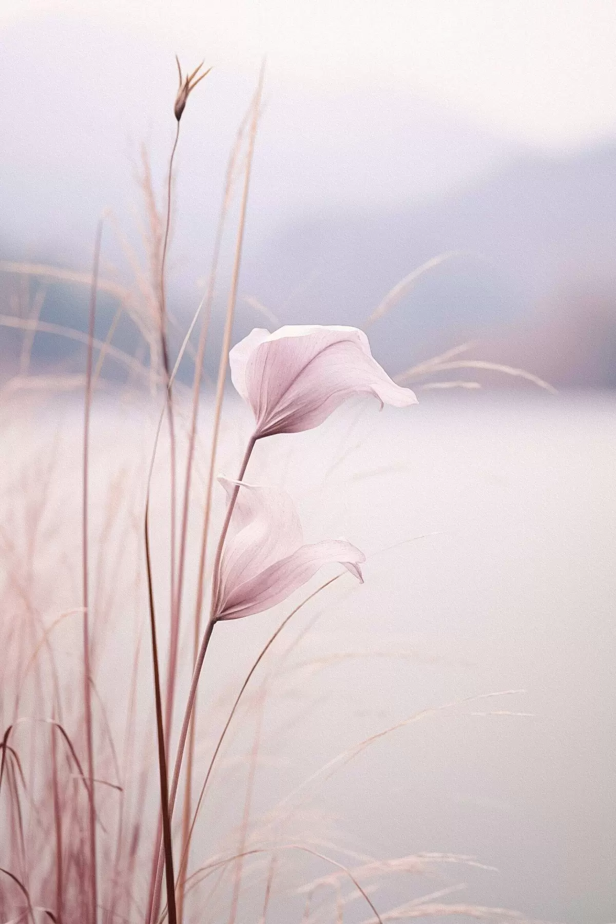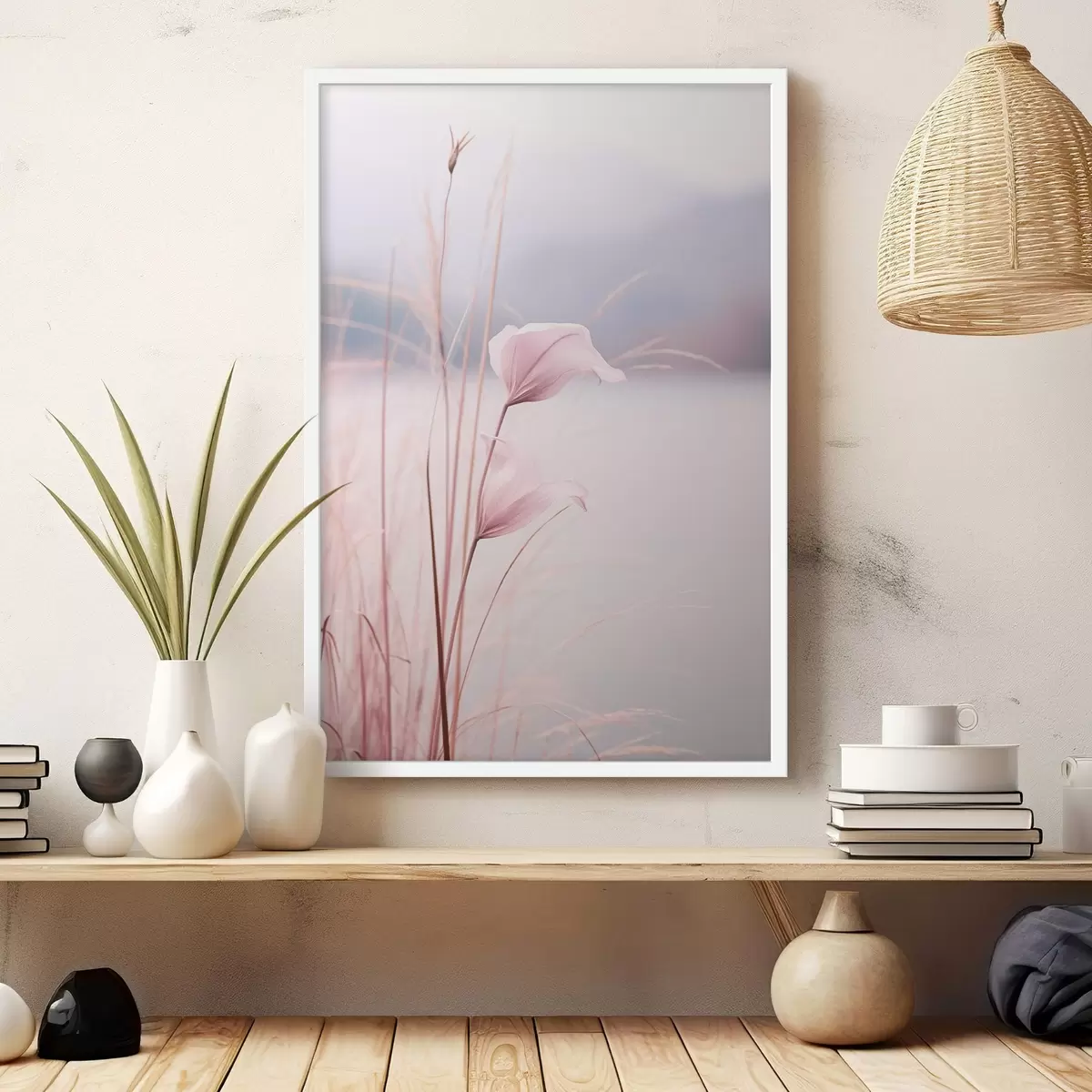 Poster Finom rózsaszín virágok a nyugodt tóparton Nr f46503