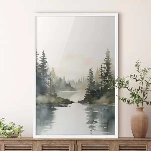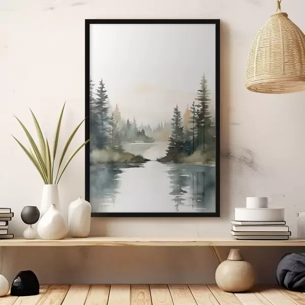 Poster Ködös tűlevelű erdő a nyugodt folyó felett, akvarell stílusban Nr f46507