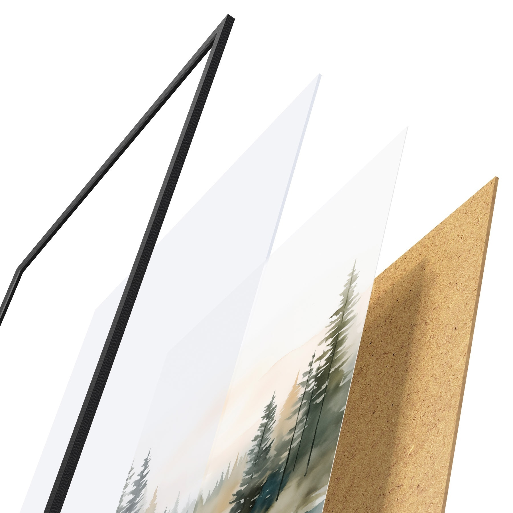 A poszter keretből, plexiből, nyomtatott képből és forgácslap hátlapból áll. A poszter a hátoldalon található rögzítőknek köszönhetően azonnal felakasztható a falra.