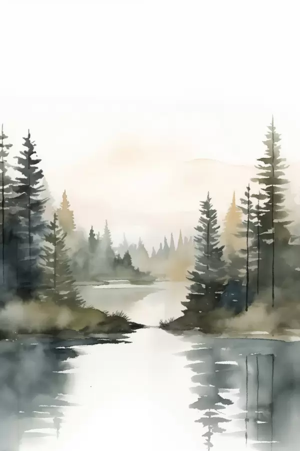 Poster Ködös tűlevelű erdő a nyugodt folyó felett, akvarell stílusban Nr f46507