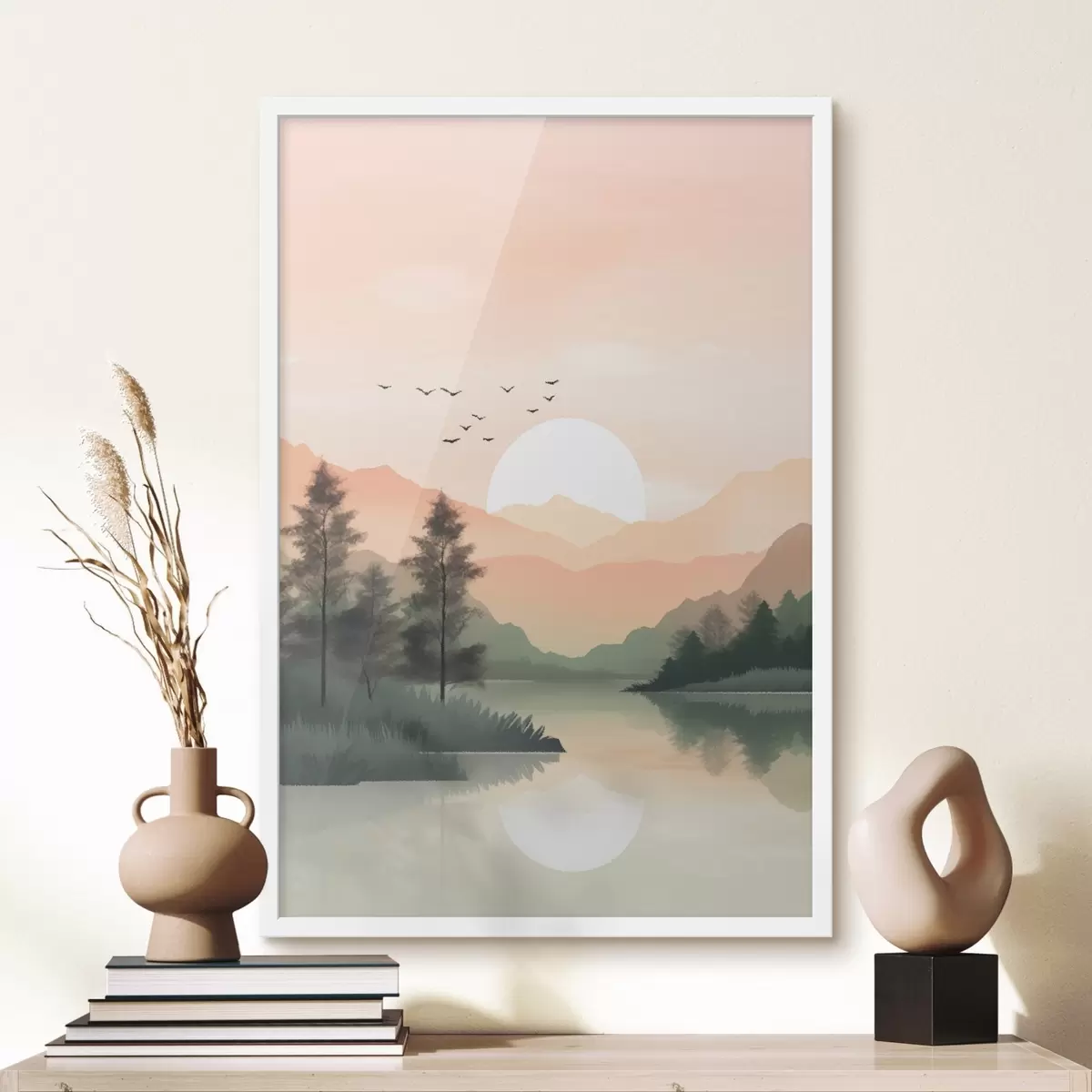 Poster Pasztell színű naplemente egy csendes tó felett, távoli dombokkal és madarakkal Nr f46508