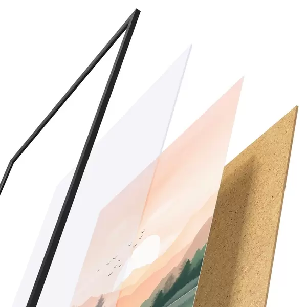 A poszter keretből, plexiből, nyomtatott képből és forgácslap hátlapból áll. A poszter a hátoldalon található rögzítőknek köszönhetően azonnal felakasztható a falra.