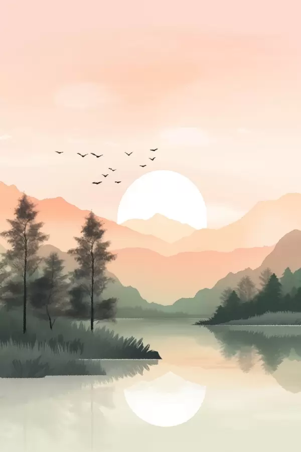Poster Pasztell színű naplemente egy csendes tó felett, távoli dombokkal és madarakkal Nr f46508