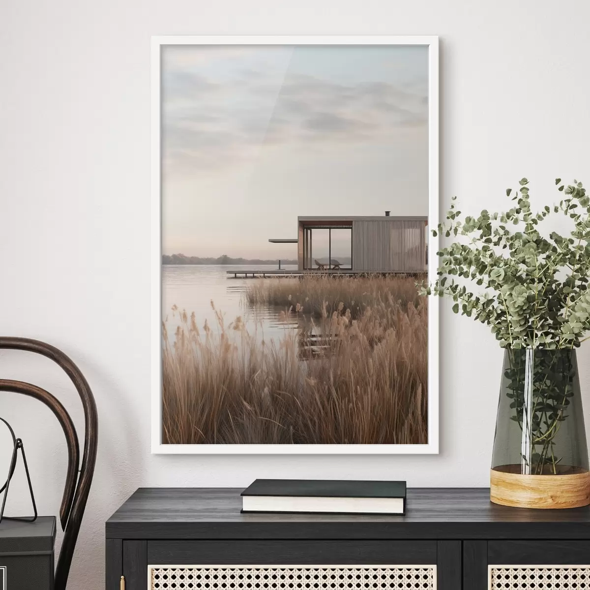 Poster Modern tóparti faház a nádas között, lágy alkonyatkor Nr f46513