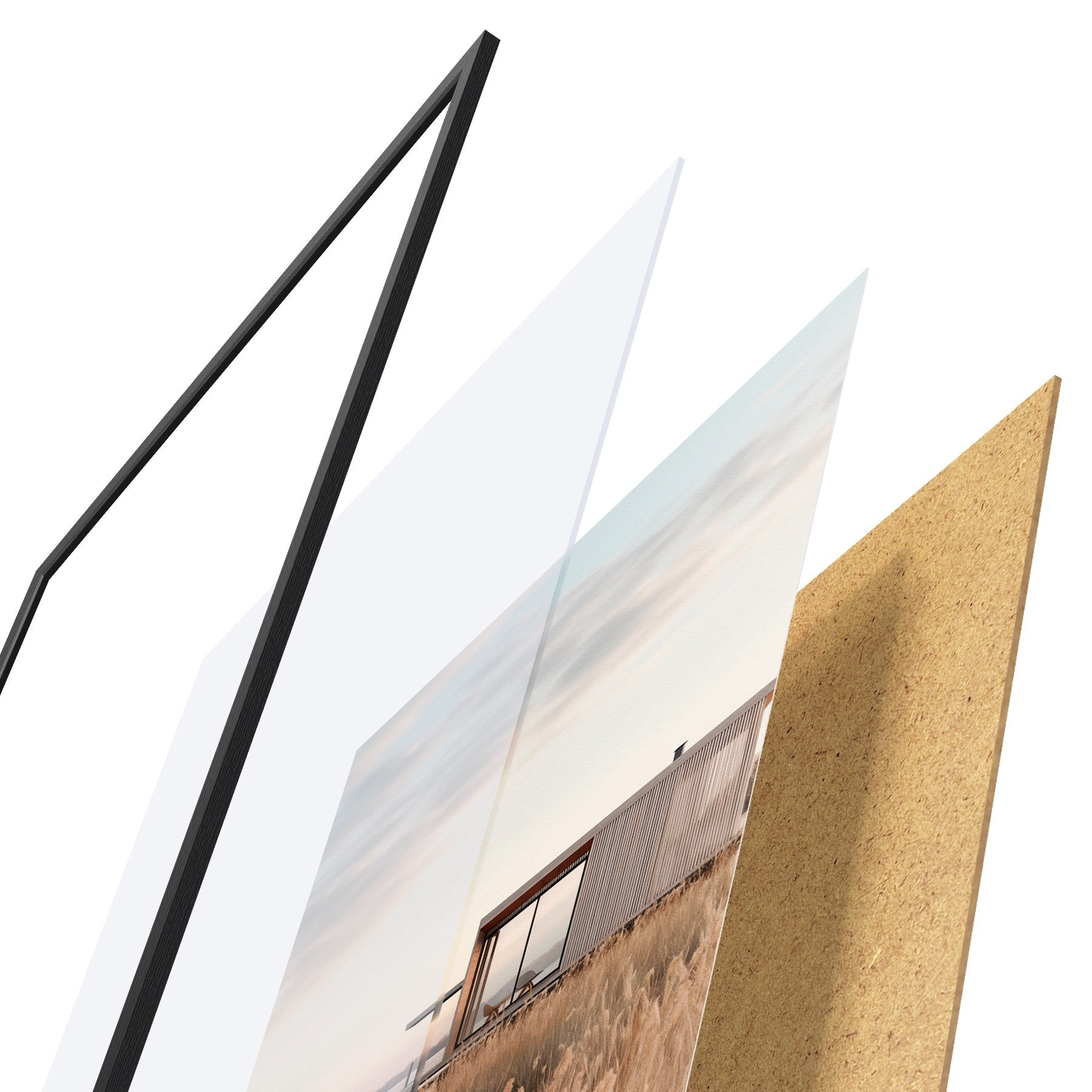 A poszter keretből, plexiből, nyomtatott képből és forgácslap hátlapból áll. A poszter a hátoldalon található rögzítőknek köszönhetően azonnal felakasztható a falra.