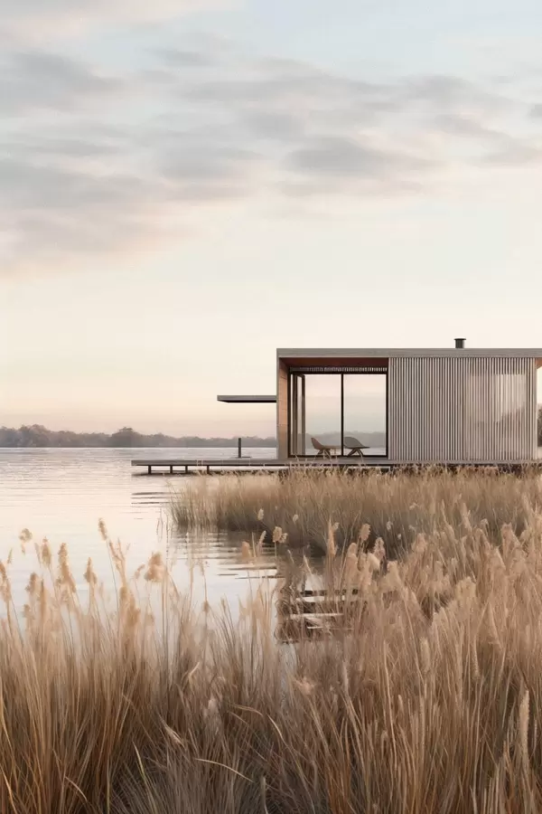 Poster Modern tóparti faház a nádas között, lágy alkonyatkor Nr f46513
