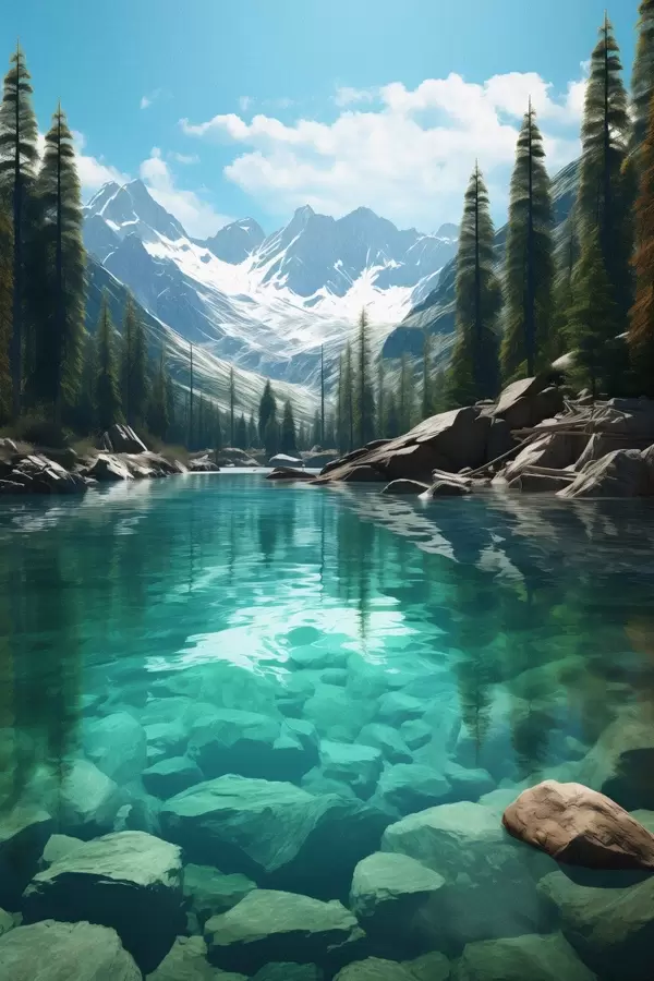 Poster Tiszta alpesi folyó sziklás mederrel és havas csúcsokkal Nr f46514