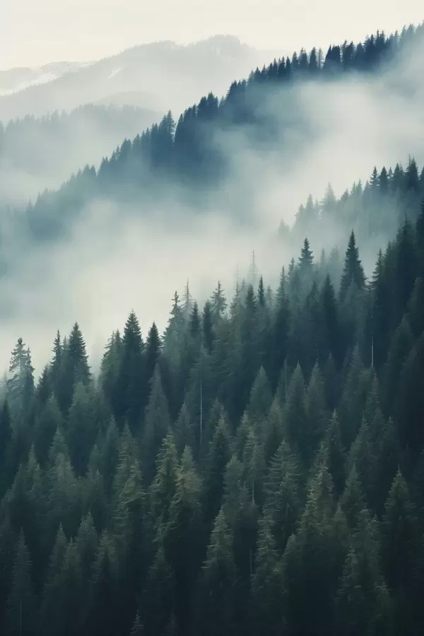 Poster Köd a tűlevelű lejtők felett, mélyzöld árnyalatok Nr f46516