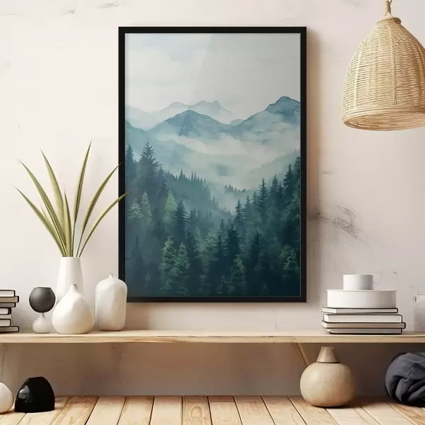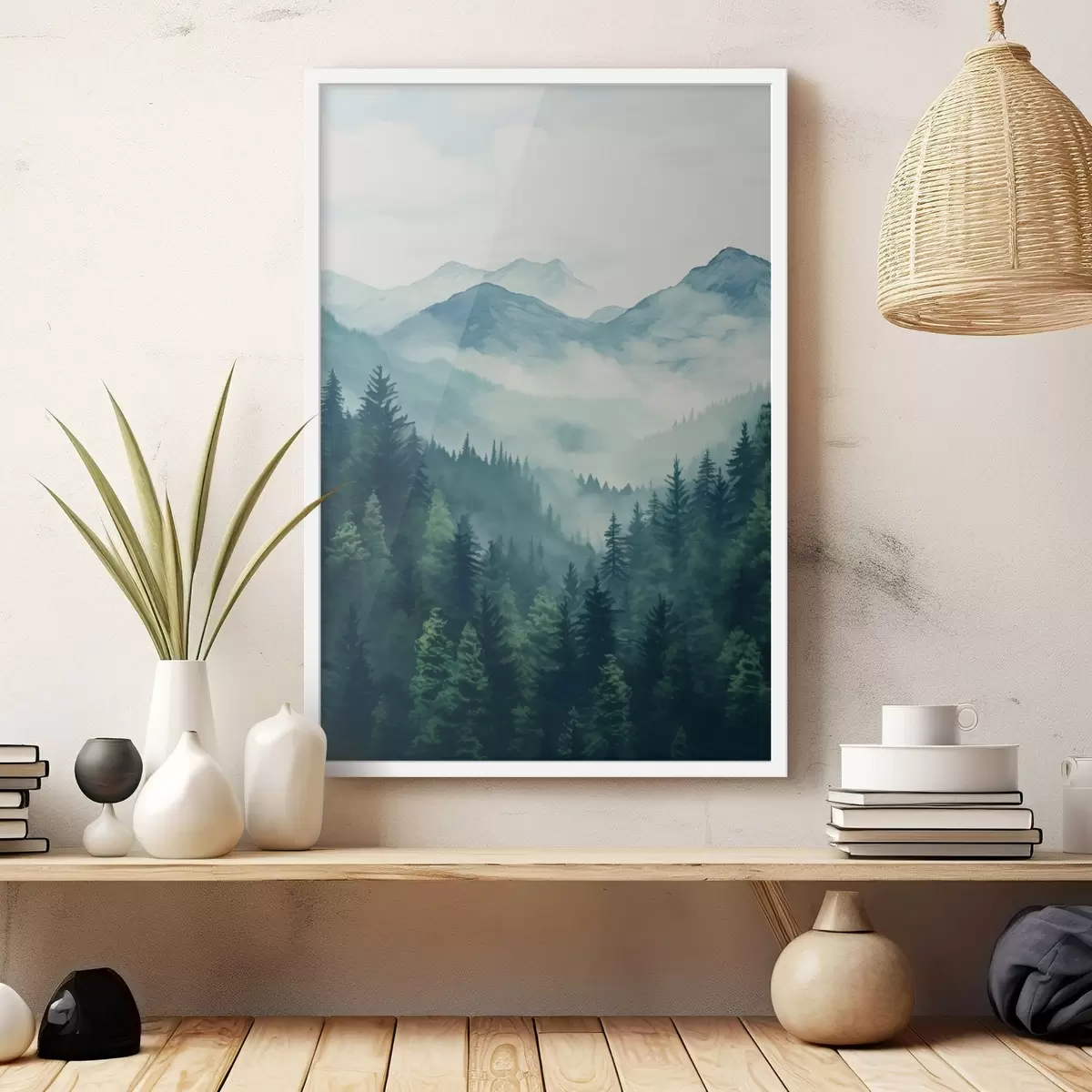 Poster Akvarell hegyek és erdő a lágy reggeli ködben Nr f46519