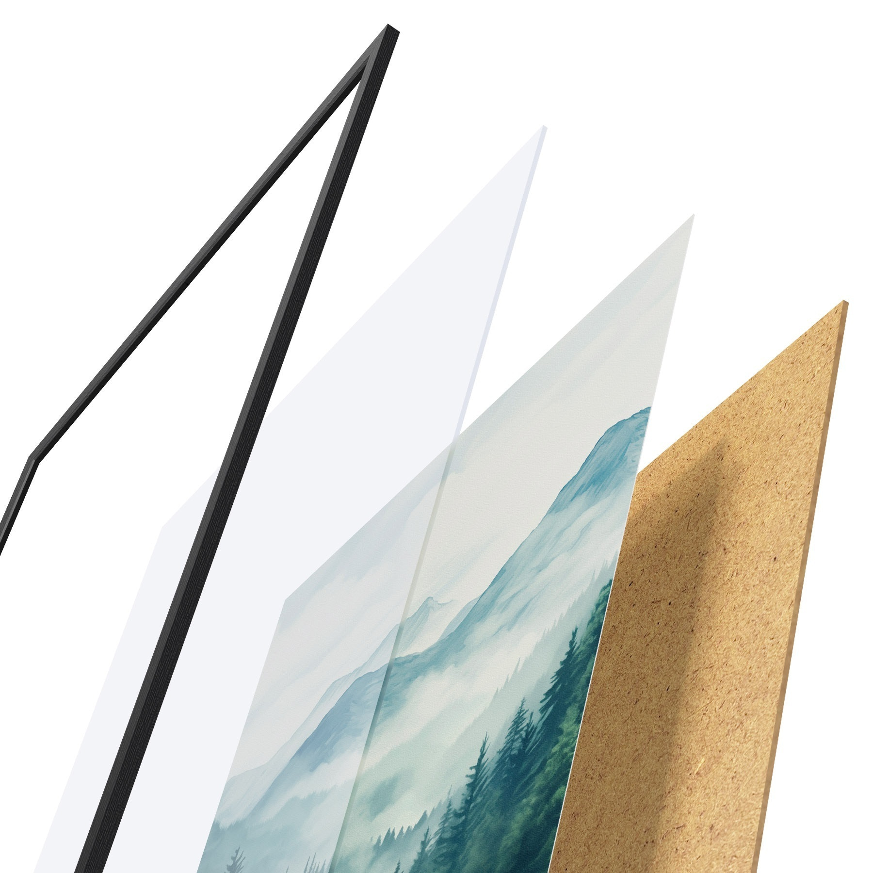 A poszter keretből, plexiből, nyomtatott képből és forgácslap hátlapból áll. A poszter a hátoldalon található rögzítőknek köszönhetően azonnal felakasztható a falra.