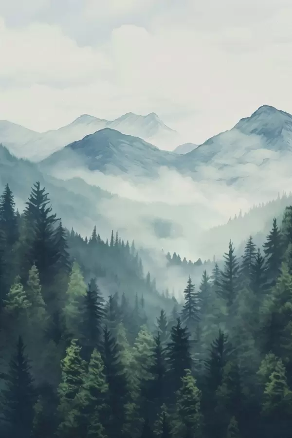 Poster Akvarell hegyek és erdő a lágy reggeli ködben Nr f46519