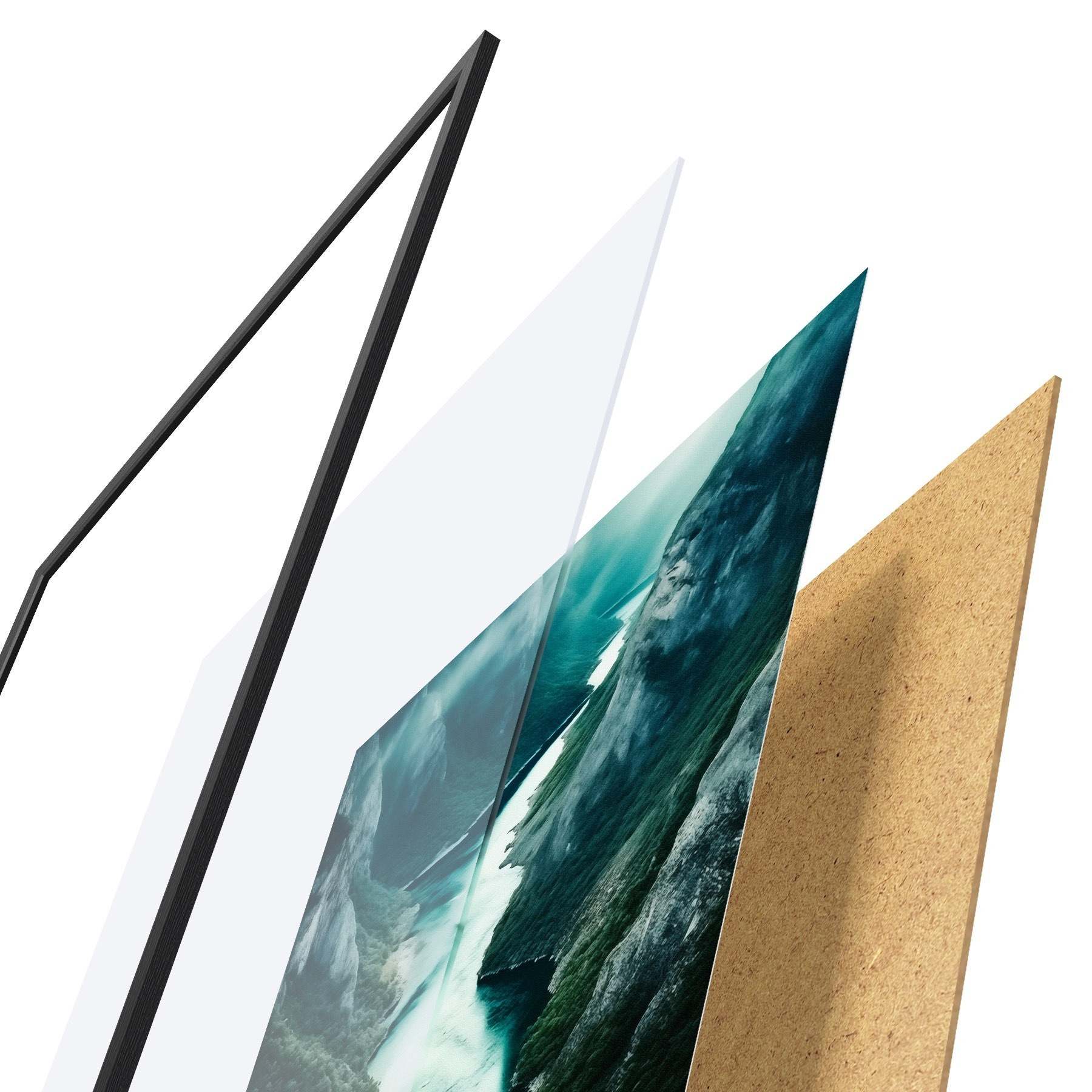 A poszter keretből, plexiből, nyomtatott képből és forgácslap hátlapból áll. A poszter a hátoldalon található rögzítőknek köszönhetően azonnal felakasztható a falra.