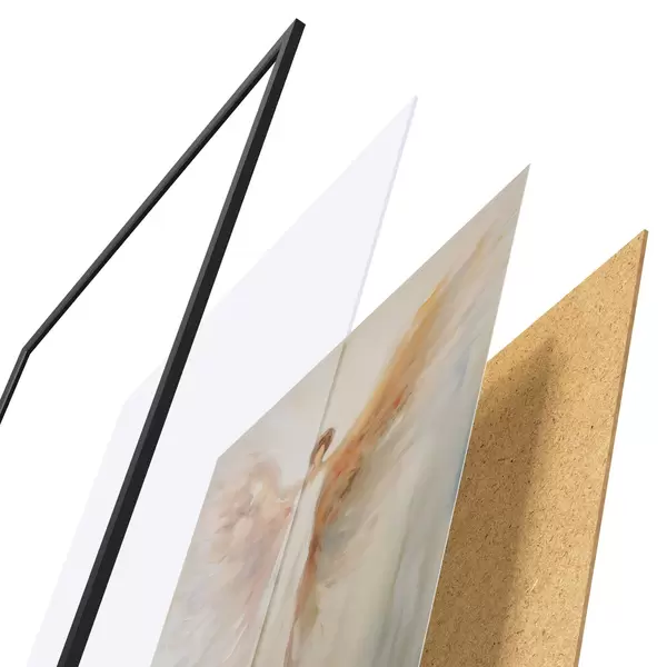 A poszter keretből, plexiből, nyomtatott képből és forgácslap hátlapból áll. A poszter a hátoldalon található rögzítőknek köszönhetően azonnal felakasztható a falra.