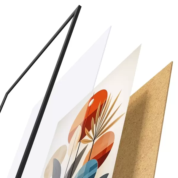 A poszter keretből, plexiből, nyomtatott képből és forgácslap hátlapból áll. A poszter a hátoldalon található rögzítőknek köszönhetően azonnal felakasztható a falra.