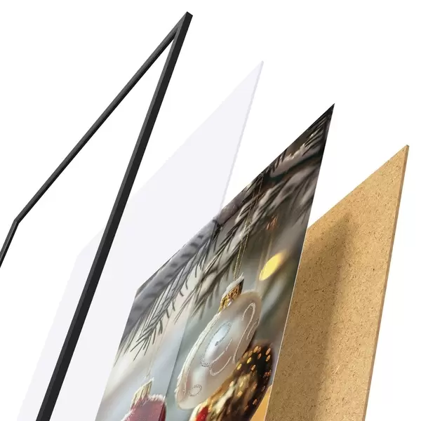 A poszter keretből, plexiből, nyomtatott képből és forgácslap hátlapból áll. A poszter a hátoldalon található rögzítőknek köszönhetően azonnal felakasztható a falra.