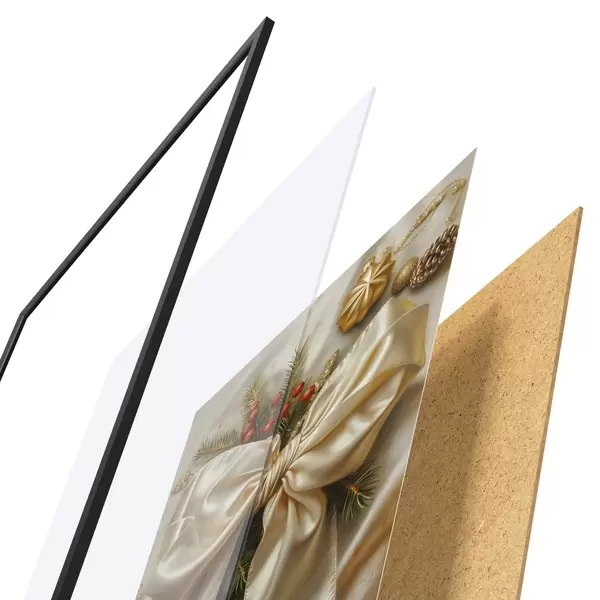 A poszter keretből, plexiből, nyomtatott képből és forgácslap hátlapból áll. A poszter a hátoldalon található rögzítőknek köszönhetően azonnal felakasztható a falra.