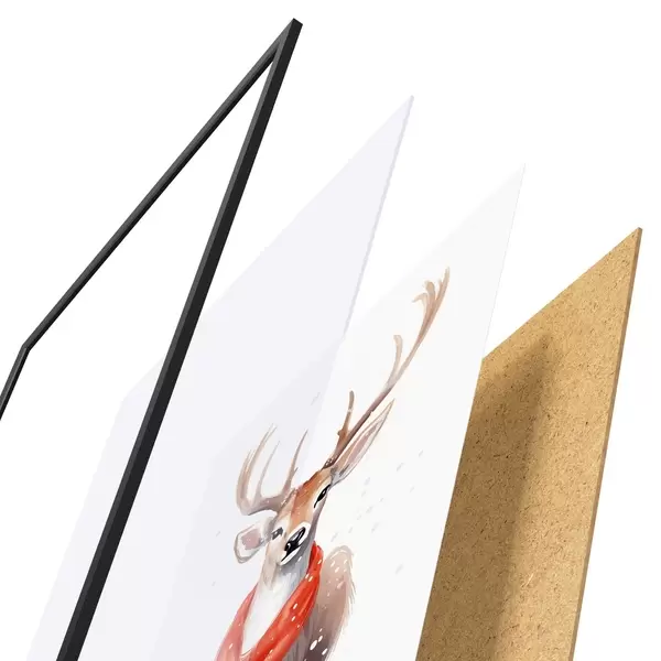 A poszter keretből, plexiből, nyomtatott képből és forgácslap hátlapból áll. A poszter a hátoldalon található rögzítőknek köszönhetően azonnal felakasztható a falra.