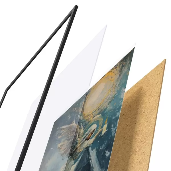 A poszter keretből, plexiből, nyomtatott képből és forgácslap hátlapból áll. A poszter a hátoldalon található rögzítőknek köszönhetően azonnal felakasztható a falra.