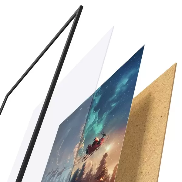 A poszter keretből, plexiből, nyomtatott képből és forgácslap hátlapból áll. A poszter a hátoldalon található rögzítőknek köszönhetően azonnal felakasztható a falra.